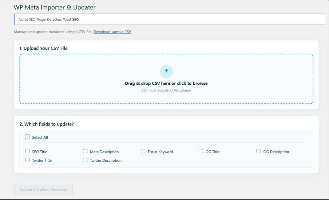 Instead of manually editing meta titles and descriptions one by one, you can upload a CSV file containing URLs and metadata values, select the fields to update, and apply changes in a single operation.