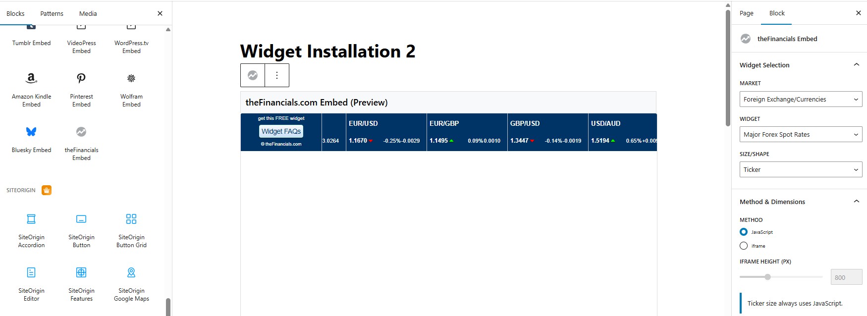 The plugin provides the full widget catalog from theFinancials.com. You choose the Market, Widget, Size/Shape and embed Method (JavaScript or iframe).