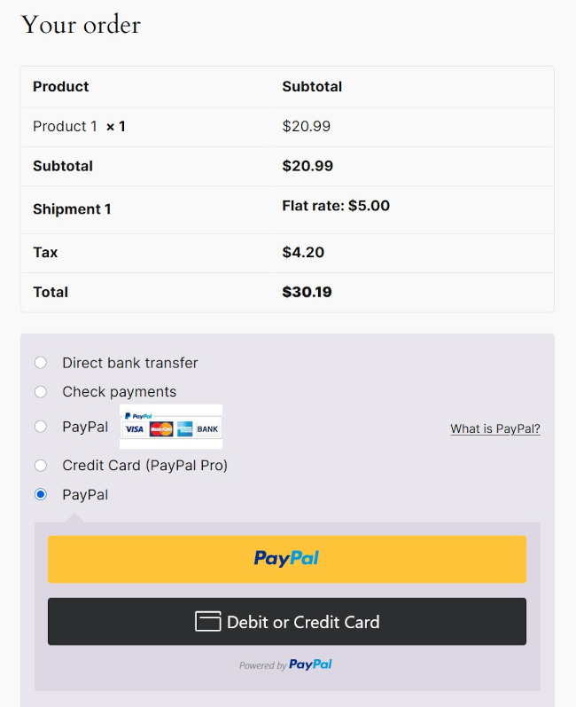 - Two payment gateways in one plugin: PayPal Pro and PayPal Checkout.