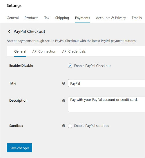 Go to WooCommerce > Settings > Payments > PayPal Checkout. Enable the gateway, then use the API Connection tab to connect your PayPal account with one click. See the PayPal Checkout documentation for detailed instructions.